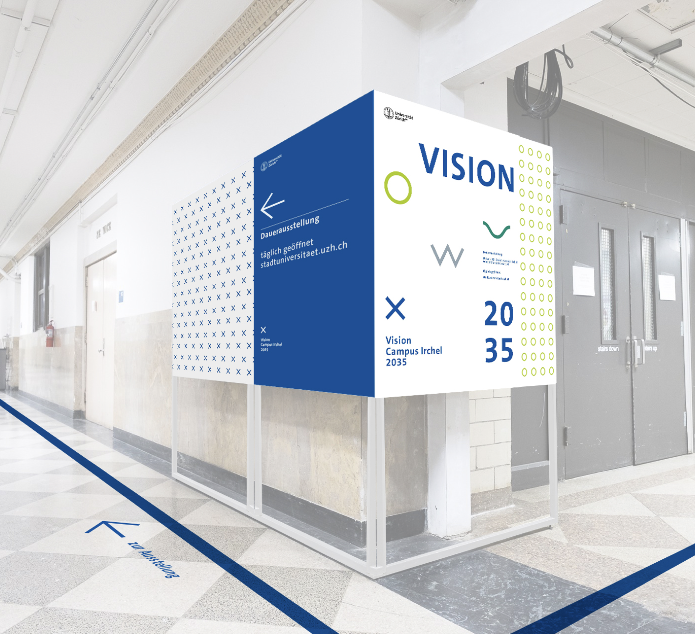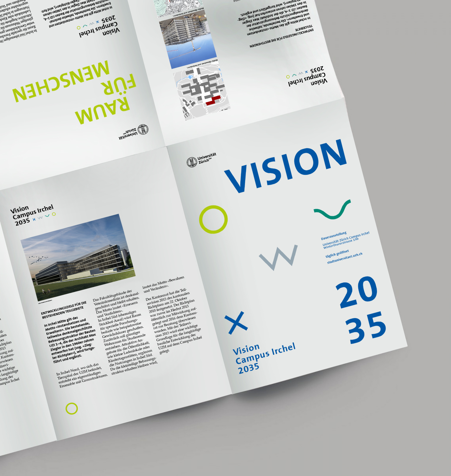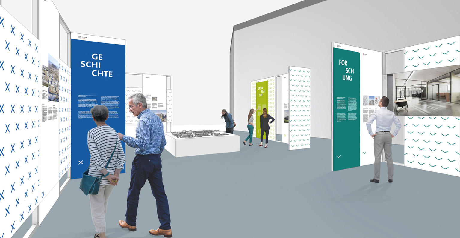 Developed as part of a pitch, this exhibition concept was designed to engage and inspire visitors about the «Campus Irchel 2035» construction project. Through posters, models, film, text, and signage, a clearly structured spatial narrative was created that combines information with an immersive experience. Project with Aroma AG, 2019