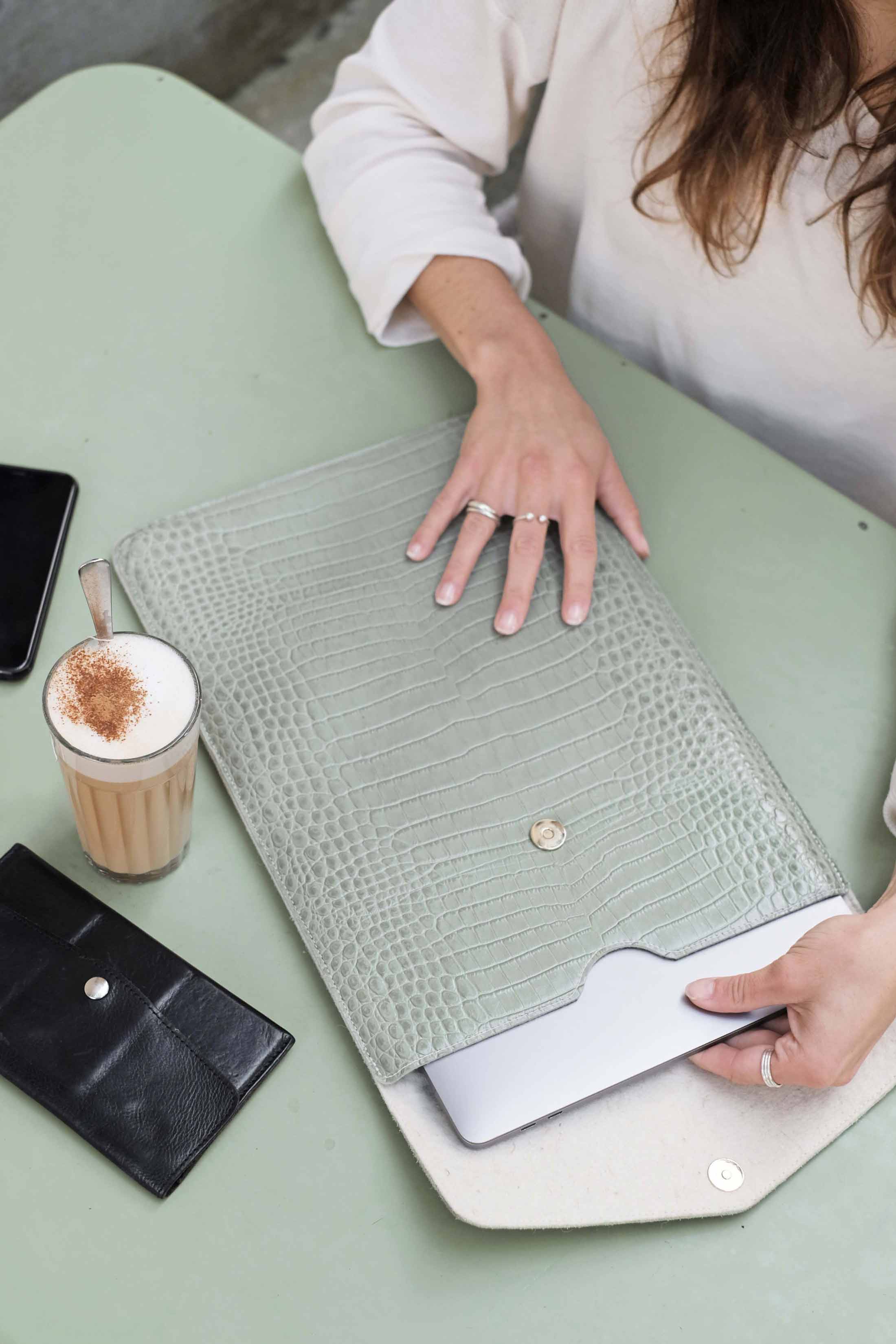 , a simple backpack, a matching wallet and a laptop sleeve were created from embossed leather.