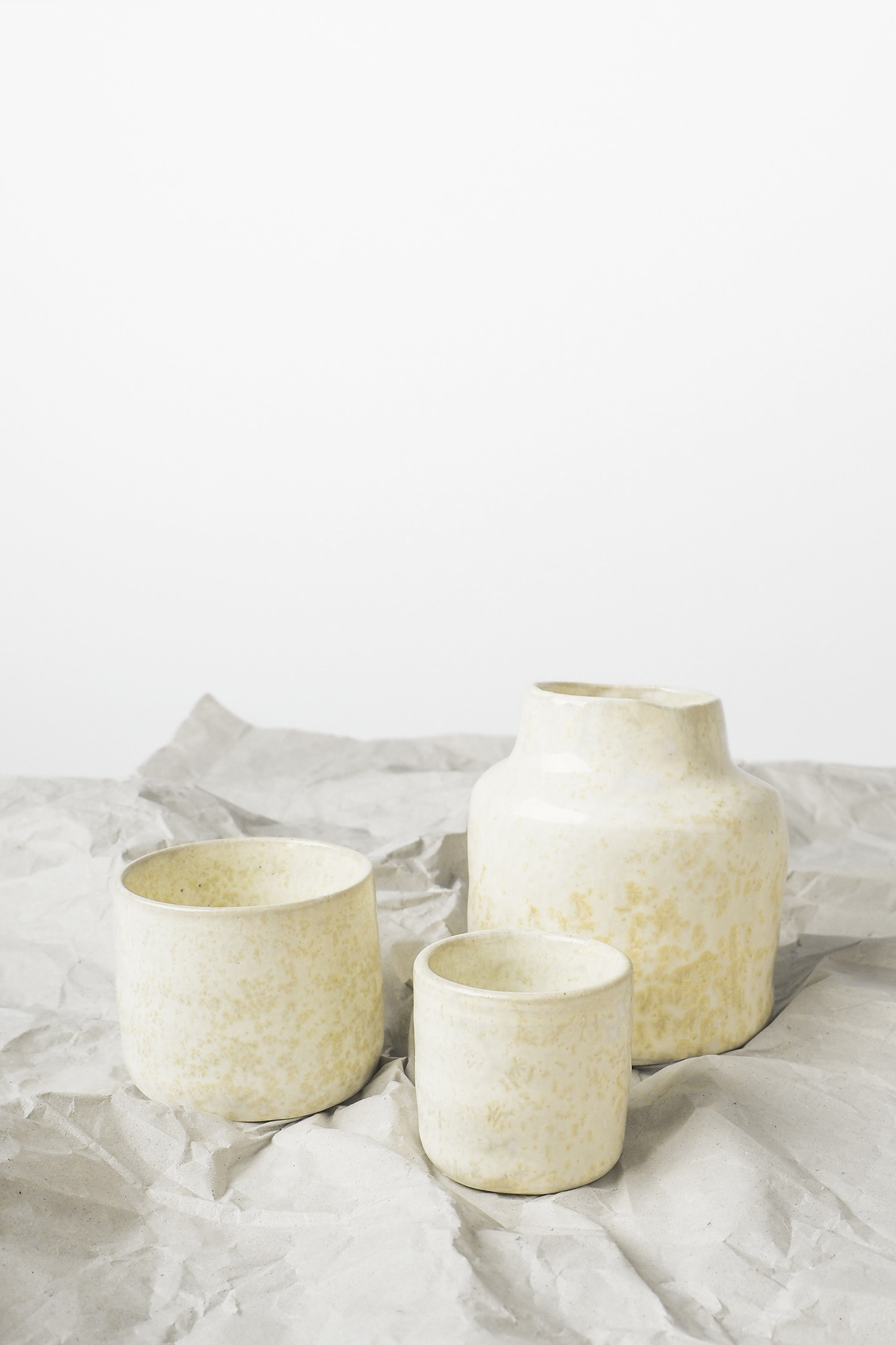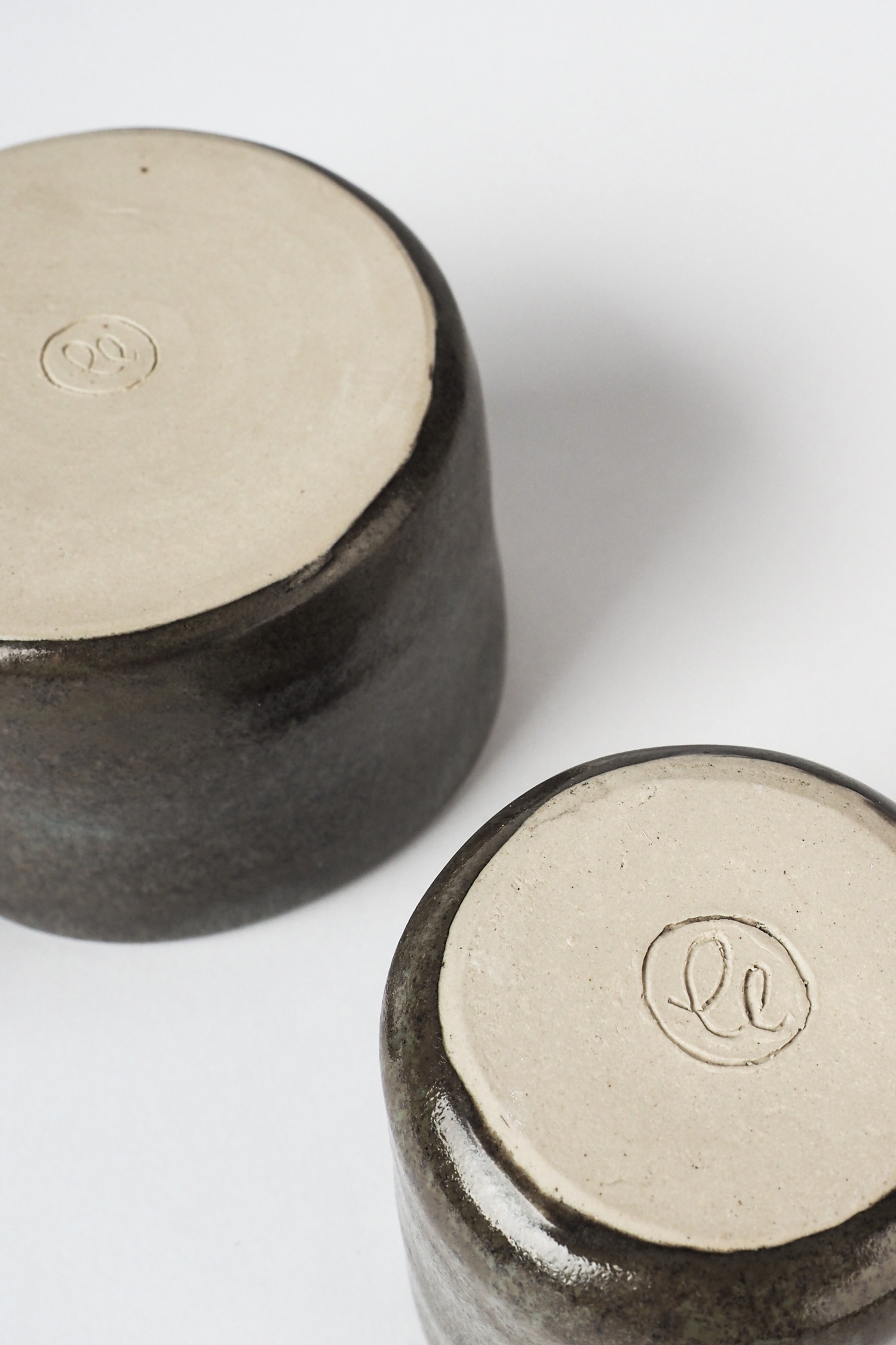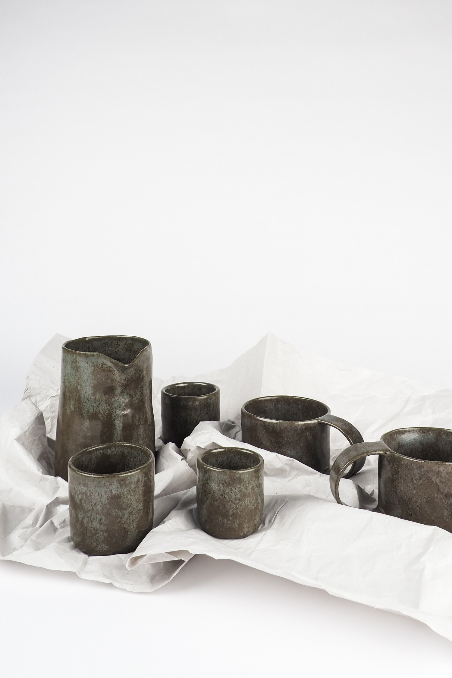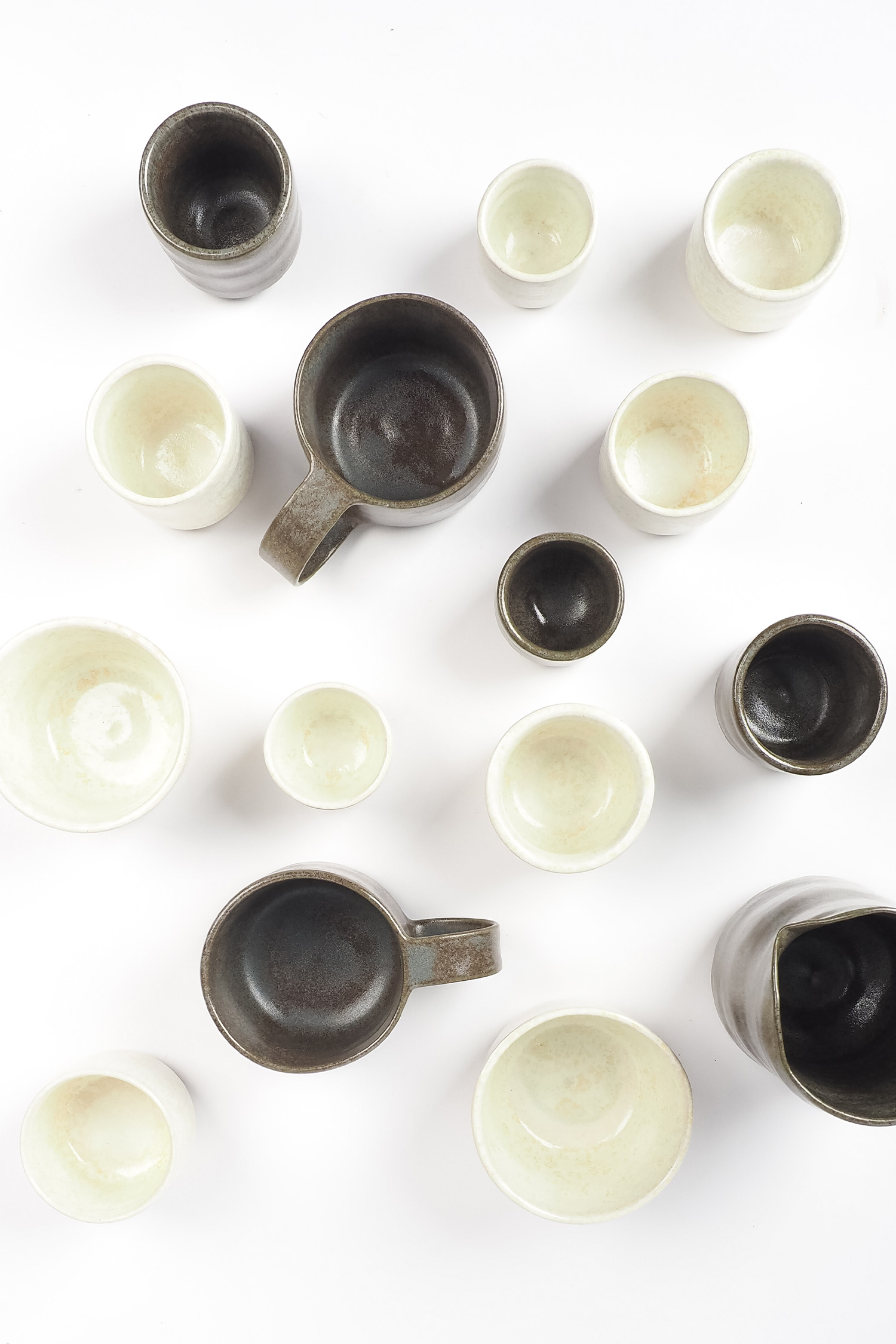 A small series of vessels made of glazed stoneware clay. Each piece is unique and has irregularities due to the craft.